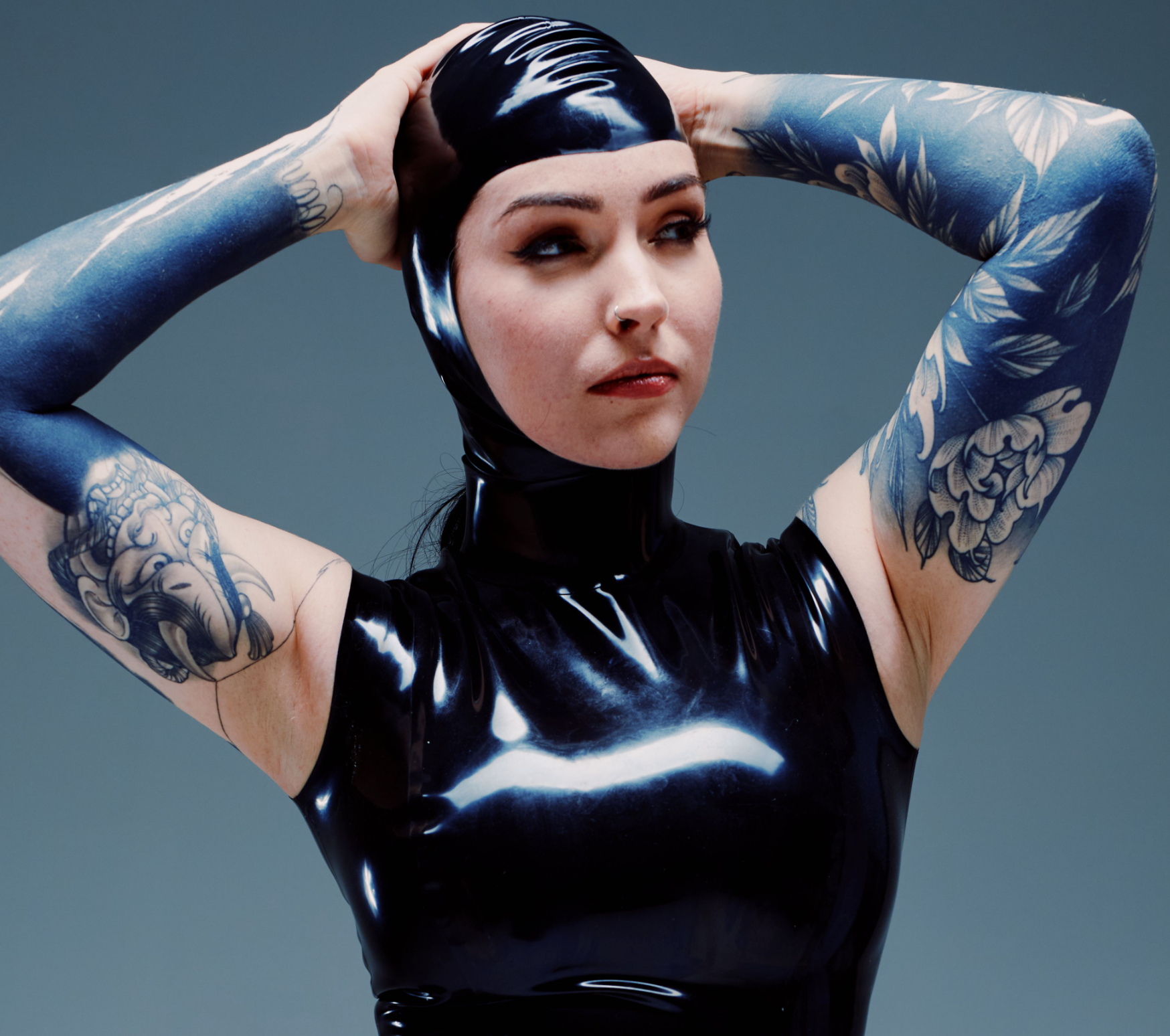 Open-face hood for a complete latex look.